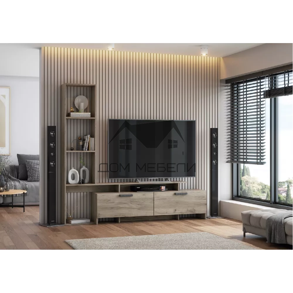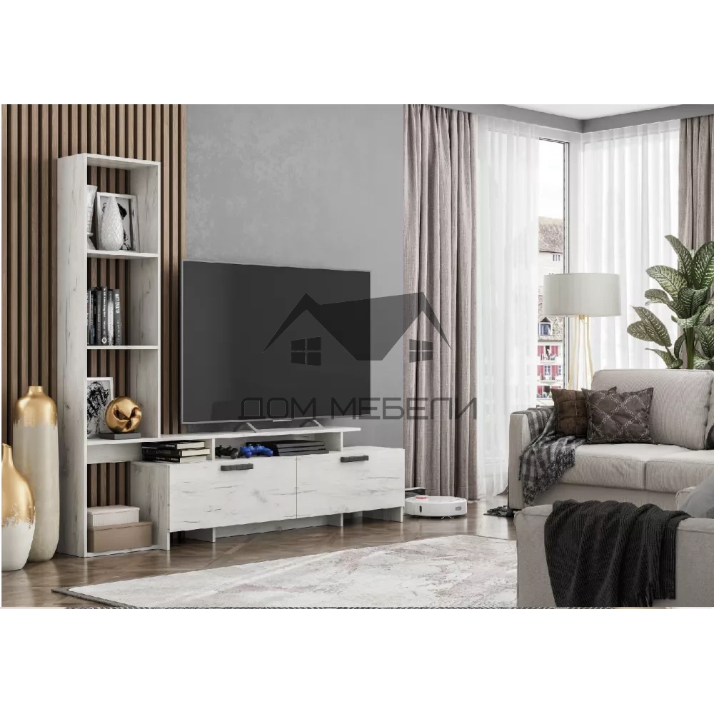 Размер (Ш*В*Г): 1872*1750*310 Ниша под ТВ: 1472*1250*220 Материал корпуса: ЛДСП Материал фасада: ЛДСП Цветовое решение: Дуб Крафт белый/Дуб Крафт белый, Дуб Крафт серый/Дуб Крафт серый
