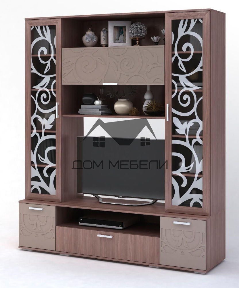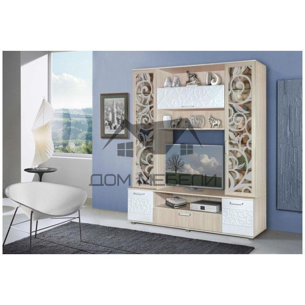Гостиная "Асти" имеет глянцевый фасад, стекла в центральной секции декорированы оригинальным узором. Стенка состоит из центральной секции под телевизор, пенала с полками и платяным шкафом. Цветовые решения : Корпус — Ясень шимо темный, Фасад — Кофе с молоком глянец/Ясень шимо темный, Корпус — Дуб Белфорт , Фасад — Белый глянец/Дуб Белфорт. (выпускается только в данных цветах) Размеры: 1816*2150*516 мм. Ниша под ТВ: 1016*799*516