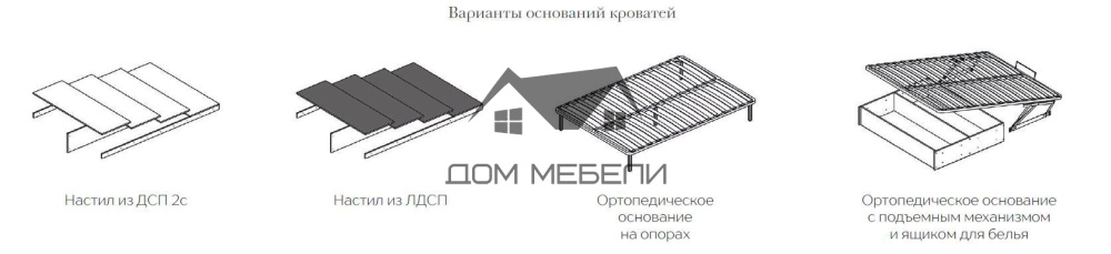 Кровать не комплектуется основанием! Дополнительно вы можете приобрести настил для кроватей, ортопедическое основание на опорах для кроватей или ортопедическое основание с подъемным механизмом для кроватей.