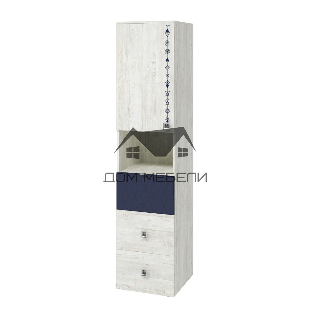 Модульная серия "Поло" - это удобная, комфортная и современная мебель для комнаты Ваших детей. Большой модельный ряд, три вида фасадов, разных тематик, эргономика и функциональность. Все корпуса серии выполнены из ЛДСП 16 мм Сосна Винтерберг. Фасады декорированы УФ печатью и цветными вставками из ЛДСП и МДФ. Современное прочтение комнаты для подростка любого пола можно найти в этой мебели. Преимущества модульной спальни - возможность купить модули по отдельности даже после приобретения базовой комплектации. Высокий напольный шкаф-пенал с полками распашной дверцей сверху и выдвижными ящиками внизу.