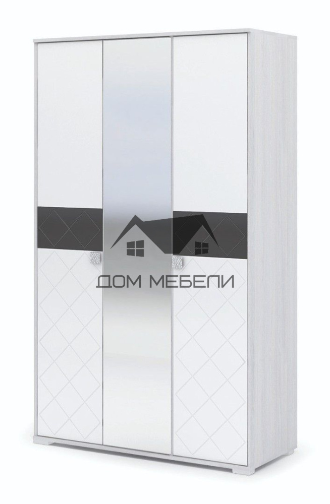 Шкаф 3-створчатый Сальма привлекает внимание своим необычным дизайном, но при этом выглядит солидно и будет уместен в интерьере гостиной, прихожей, спальной или детской комнаты. Белые глянцевые фасады в сочетании с геометричной отделкой, лаконичными контрастными вставками и стильными ручками позволят использовать в дизайне спальни любые яркие материалы, а также занять достойное место как в светлом, так и в темном интерьере спального помещения. Центральный фасад модели содержит большое зеркальное полотно, что придает шкафу оригинальный вид и расширяет пространство в помещении. Внутреннее наполнение представлено полками и отделом со штангой.