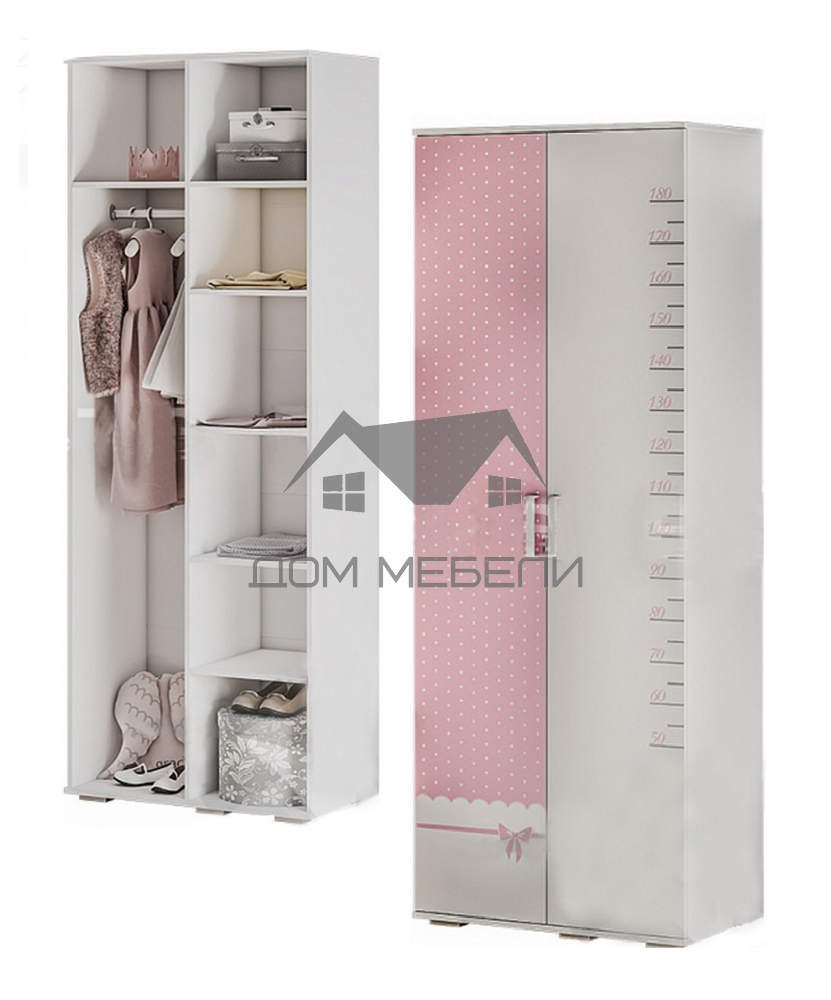 Универсальность сборки двухстворчатого шкафа ШК-09 как на правую, так и на левую сторону позволяет хранить вещи в удобном для ребенка варианте. Плательное отделение оснащено хромированной штангой овальной формы и антресольной полкой. Второе отделение шкафа имеет шесть полочных отделов.