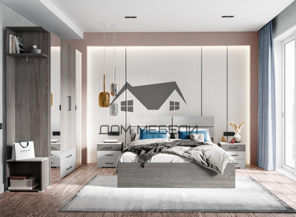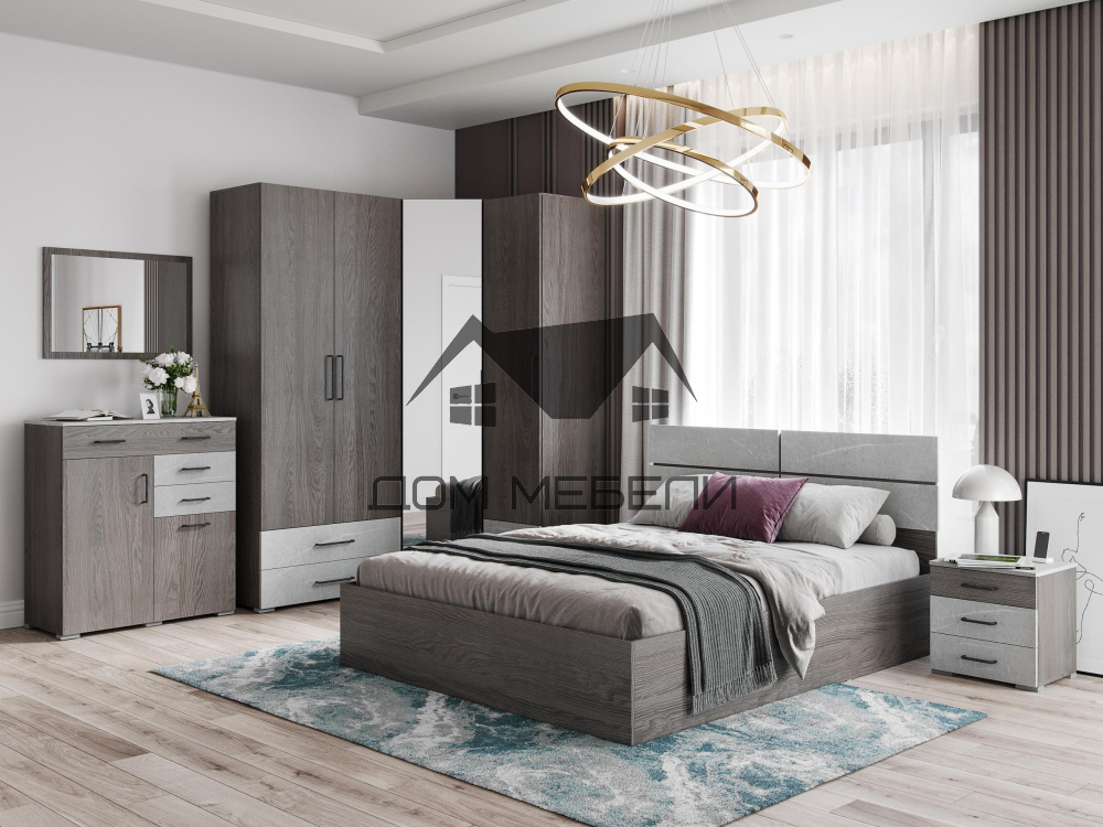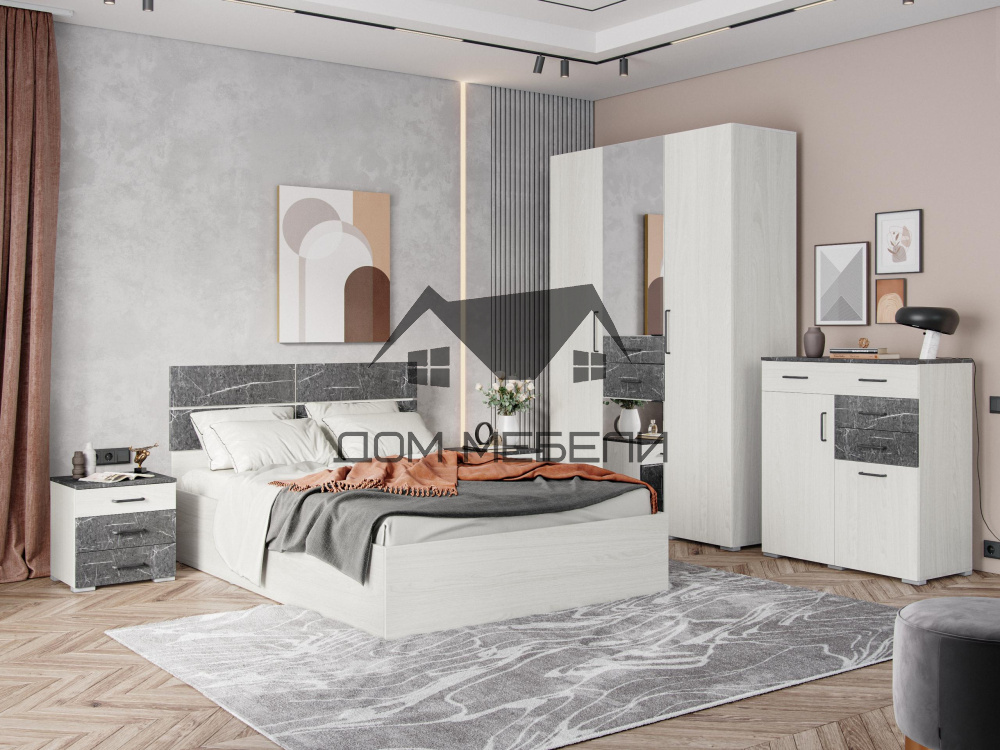 — Спальный гарнитур выполнен в цветах: «Ясень Анкор Темный» или «Ясень Анкор Светлый» с фасадами, крышками и накладками из МДФ в пленке ПВХ цвета «Мрамор лайт» или «Мрамор дарк» соответственно.